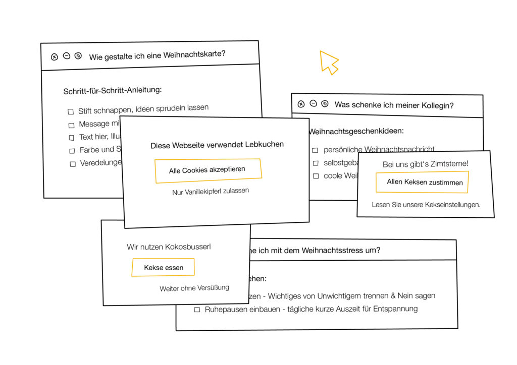 Bei diesem Design habe ich auch wieder Oberflächen des Computers auf eine (dann analoge) Weihnachtskarte übertragen. Diesmal sind es allerdings Webseiten, wo plötzlich Cookie-Einstellungen aufpoppen! Aber nicht irgendwelche Cookies, es geht natürlich um Weihnachtskekse! Hier zum Mini-Portfolio.