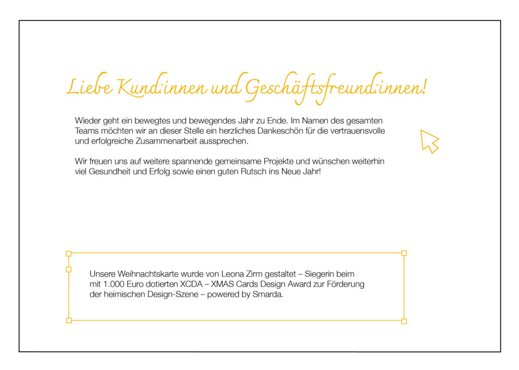 Dieses Design wendet sich an die Zielgruppe: Designer:innen. Es geht um die Abwesenheit von neuen, coolen Ideen rund ums Thema Weihnachtskarte und stellt diese auf eine hoffentlich etwas schicke Art und Weise mithilfe einer Illustration von etwa Indesign dar. Hier zu einem Mini-Portfolio!